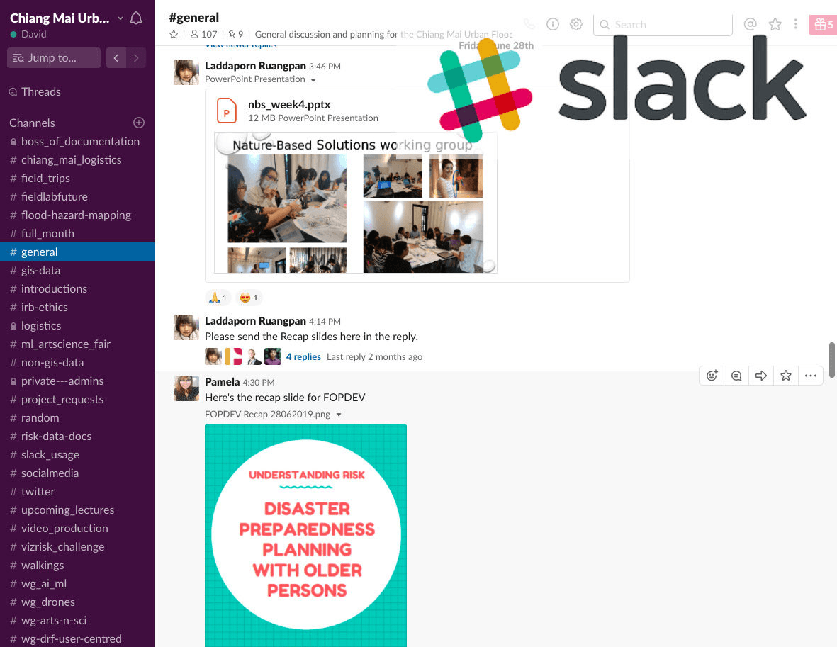A Slack workspace was created several months prior to the event and added registered participants to discussion channels based on themes or other matters. This facilitated conversations prior to the field lab, discussion / advice on logistical matters, sharing of references etc. During the Field Lab the slack workspace used for rapid communication, sharing of documents and updates. In particular, given that multiple sessions were always running in parallel, it enabled participants to stay up to date with projects even if they had to miss a session. New discussion channels were created as needed by participants.