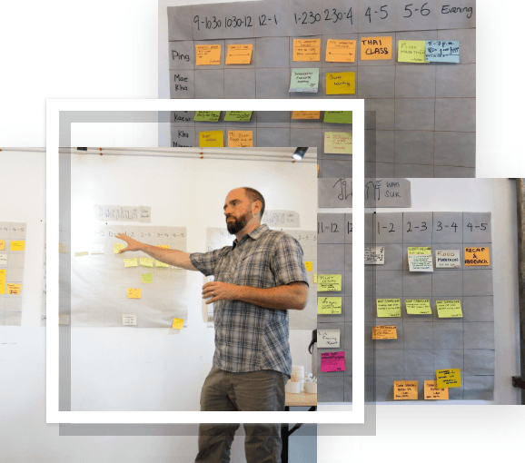 The main tool to structure the schedule of activities was “the board,” which was an analogue schedule of the week. Each day was divided grid-wise with each of the major rooms and working areas along one axis, and time slots along the other. Participants used sticky-notes to post session topics on the board, using placement of the note to indicate a location and time.