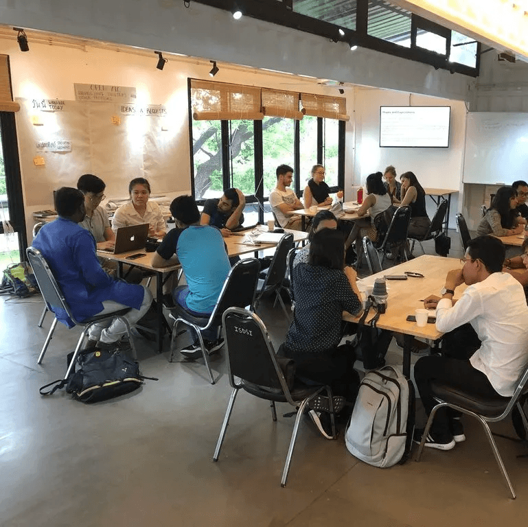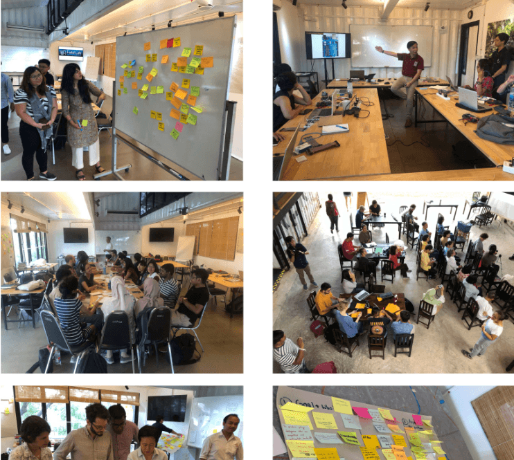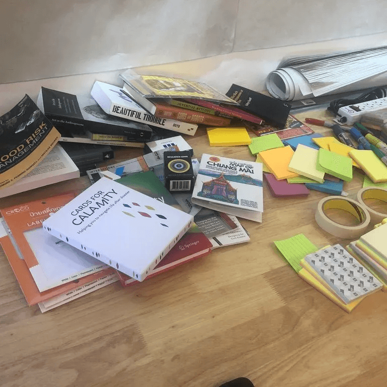 A resource library was used for participants to share books related to flood management, art, design, Thai history, and other relevant topics as well as sticky-notes, markers, scissors, tape, and other materials.